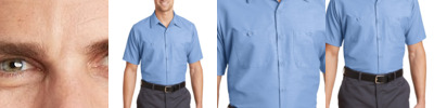 - 65/35 poly/cotton with soil-release finishOpen collar with sewn-in staysMetal collar gripper closureMelamine buttonsTwo button-through pocketsBartacked pencil stall on left pocket